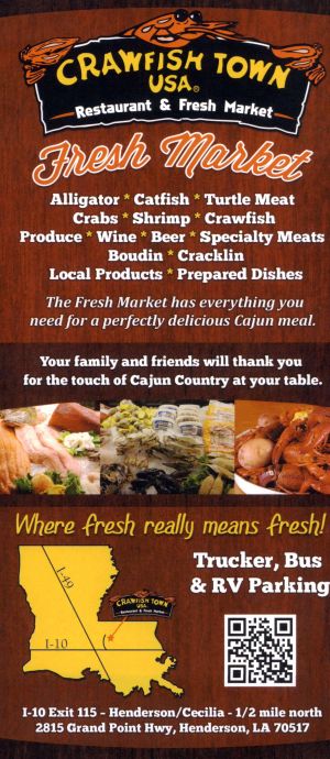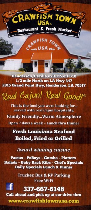 Located inside an authentic barn, the restaurant offers a wide variety of dining choices and is very family friendly. Open 7 days a week, lunch through dinner. Real Cajun! Real Good!