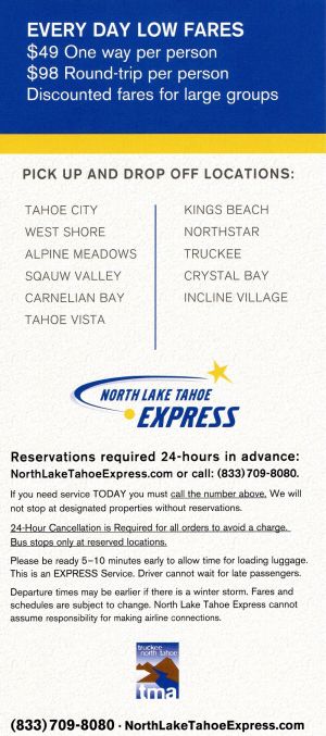Airport shuttle service with daily trips to and from Reno, North Lake Tahoe and Truckee.
