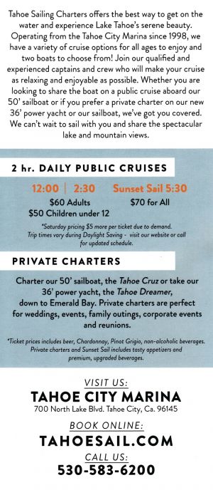 Sail on Lake Tahoe with us on skippered sailing cruises touring the North Shore. Enjoy hands on sailing or just sit back and relax. Sailing Daily from the Tahoe City Marina.